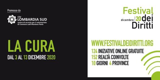 Il Festival dei Diritti giunge alla sua 14a edizione e si svolgerà sul territorio in cui CSV Lombardia Sud è presente, coinvolgendo associazioni ed enti di terzo settore di Cremona, Lodi, Mantova e Pavia. Il Festival dei Diritti si svolgerà dal 3 al 10 dicembre 2020. Il tema di questa edizione è LA CURA. Cura per la salute, ma anche all’ambiente, alle relazioni, alle comunità, alle città.
