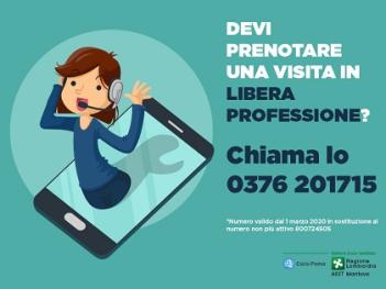 Si comunica che a partire dal 1 Marzo sarà possibile prenotare le prestazioni in libera professione tramite il nuovo numero 0376 201715 che sostituirà l'attuale numero verde 800 724 505.