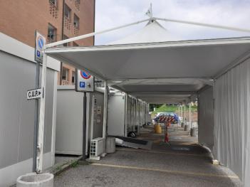 Nella foto i moduli abitativi dove vengono effettuati i tamponi e che saranno utilizzati per i pazienti del Pronto Soccorso