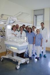 Nella foto il personale del reparto con la nuova termoculla, seconda da sinistra il direttore della struttura Valeria Angela Fasolato.
