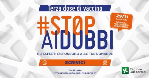 Lunedì 29 novembre, dalle ore 15 alle ore 18, in diretta sul canale ufficiale Facebook di Regione Lombardia, e ripreso dalle TV locali, si svolgerà l’evento #STOPAIDUBBI - TERZA DOSE DI VACCINO: GLI ESPERTI RISPONDONO ALLE TUE DOMANDE.